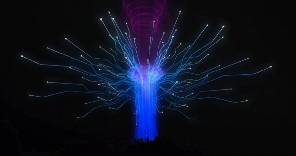 本次“太空針?biāo)睙艄庑銓⑻摂M燈光、投影和特殊效果疊加在太空針?biāo)捌渲車奶炜?,帶來一?chǎng)魔幻的AR燈光秀。