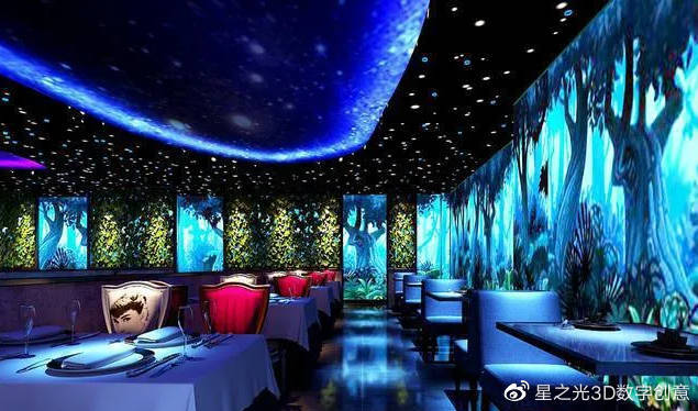 “全息餐廳”是最近幾年興起的一項新技術,將全息膠片與投影機技術結(jié)合,然后將畫面中的內(nèi)容進行還原,形成全息影像,被稱為“沉浸式”、“全息餐廳”、“三維全息沉浸式”、“3D全息餐廳”。