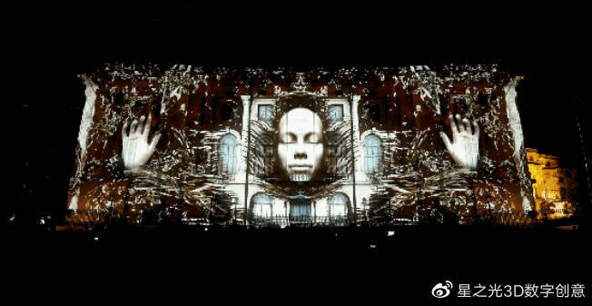 利用3D動畫技術,產生臉部藝術效果,再將其投影到人的臉部,從而構成“影像面具”,從海洋、海豚到面具碎片,都是非常精細的。