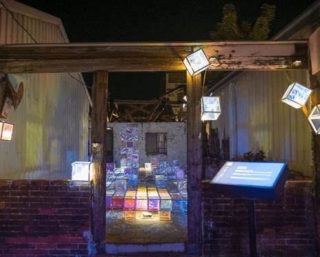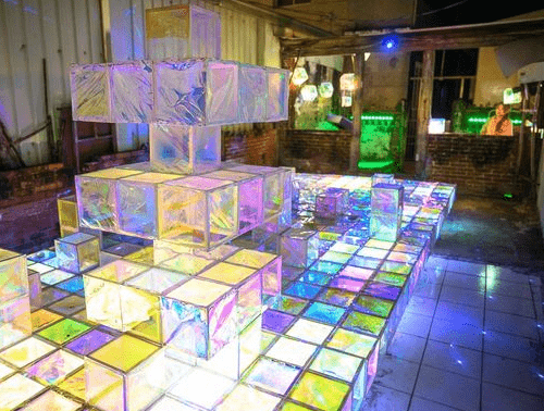 走進(jìn)廢墟裡,地板整齊排列著繽紛的方塊,這些方塊體看起來(lái)是用玻璃紙去設(shè)計(jì)的,摸起來(lái)輕薄,所以不可以坐在作品上。冰晶方塊魅力四射,再搭配燈光的照射,滿分覺(jué)得好像來(lái)到璀璨的冰晶殿堂,月之故事館的幻彩結(jié)晶也非常受歡迎。